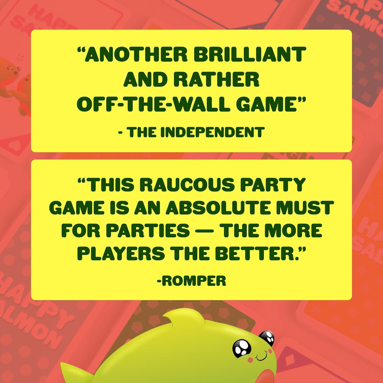 Happy Salmon: The Ultimate Party Battle! Get ready to be the center of attention with this uproarious game. Gather three to eight players and unleash the wild frenzy as you compete to move faster, shout louder, and outwit your opponents in this exhilarating 90-second free-for-all. Brace yourself for an endorphin-packed adventure that will have you laughing, sweating, and celebrating like never before. Happy Salmon, an exploding kittens card game, is the epitome of excitement, a thrilling experience that surpasses any game you've ever tried. It's a guaranteed blast, leaving you craving for more fun-filled moments!